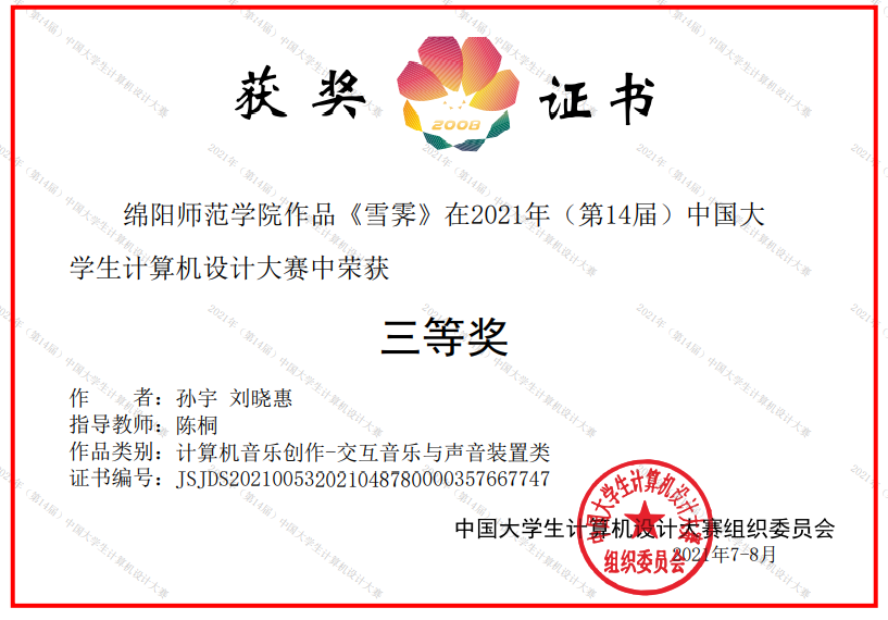 据悉,2021年(第14届)中国大学生计算机设计大赛由中国大学生计算机设计大赛组织委员会主办,决赛由杭州电子科技大学、浙江音乐学院承办,大赛围绕计算机为中心,分设软件应用与开发、微课与教学辅助、物联网应用、大数据应用、人工智能应用、信息可视化设计、数媒静态设计、计算机音乐创作等14个类别。本次大赛共有来自同济大学、武汉大学等全国340多所院校的827支参赛队伍,2100余名选手的1万余件作品参与奖项角逐。经过校级初赛、省级复赛筛选,6月中旬共计4900多件作品入围国赛,因疫情原因,国赛决赛在线上举行,400多名评审专家以线上网评与参赛选手视频答辩的形式展开评审。2021年是我校第二次组队参加中国大学生计算机设计大赛,在获得佳绩提升学校和音乐学院知名度美誉度的同时,对于培养学生的实践能力、创新能力、竞争意识和团队精神,推动教育教学改革、提高教学质量、提升办学实力具有重要意义。