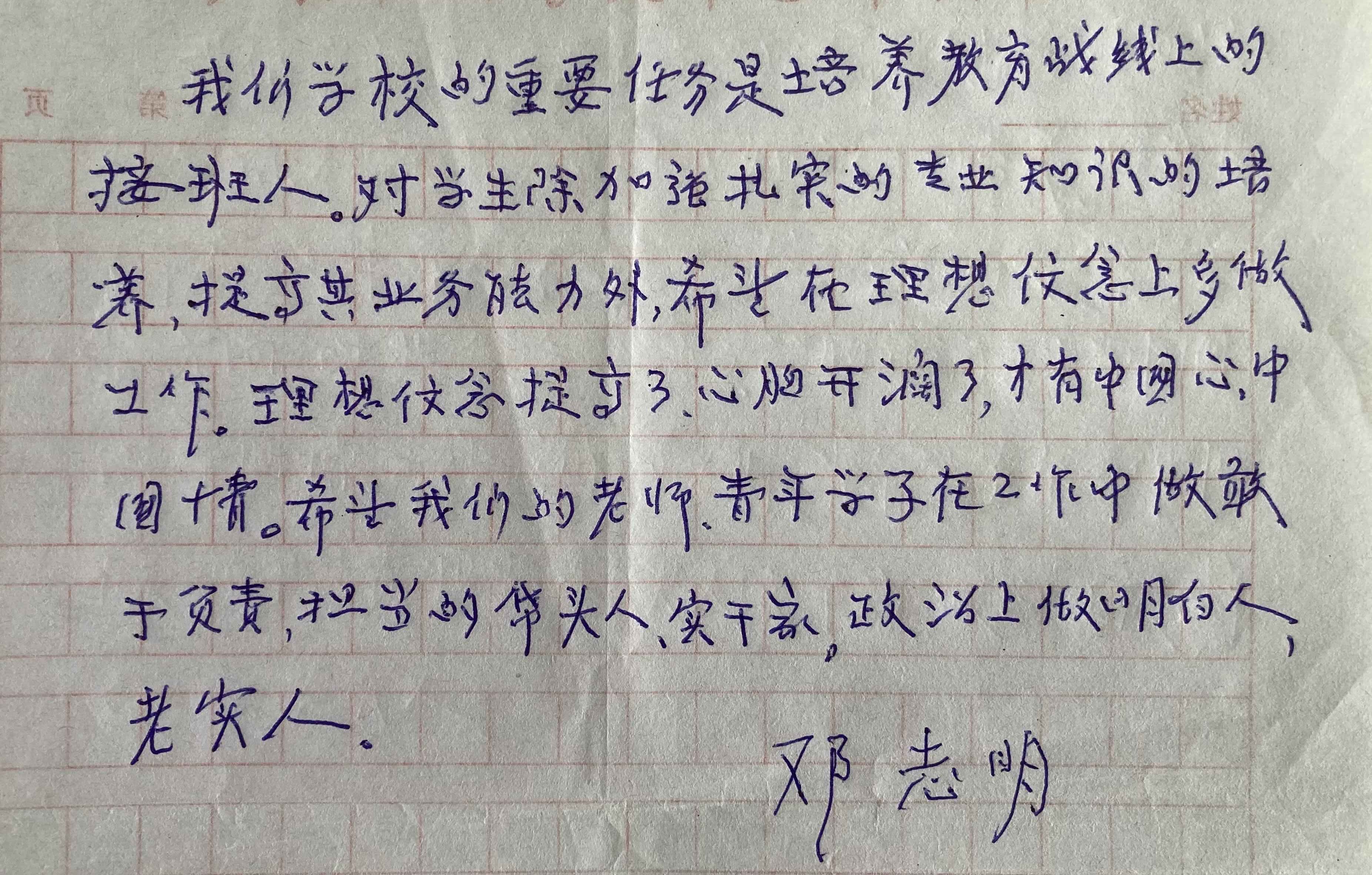 附2:建国前入党的老干部邓志明同志对学校及全体师生的寄语: