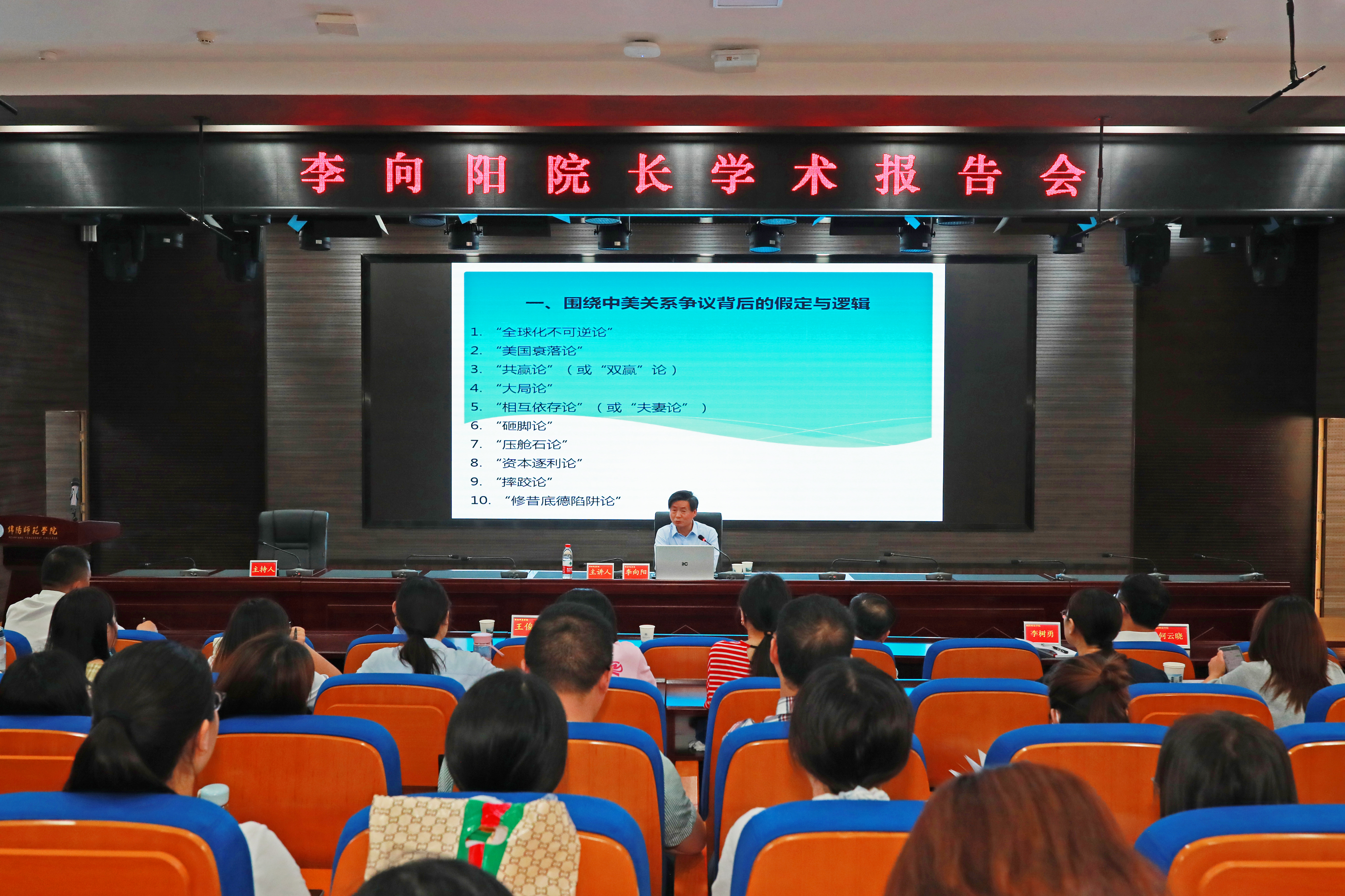 仪式结束后,李向阳作《如何看待拜登政府的对华政策》的学术报告,学校党史学习教育专题读书班成员、外国语学院学生代表参加此次报告会。报告围绕中美关系争议背后的假定与逻辑、美国对华战略的演变、应对中美关系变化的选择等三个方面展开,报告内容深入浅出、案例详实、逻辑清晰,为处理当代中美关系提供了参考意见,引起了现场聆听人员的共鸣。