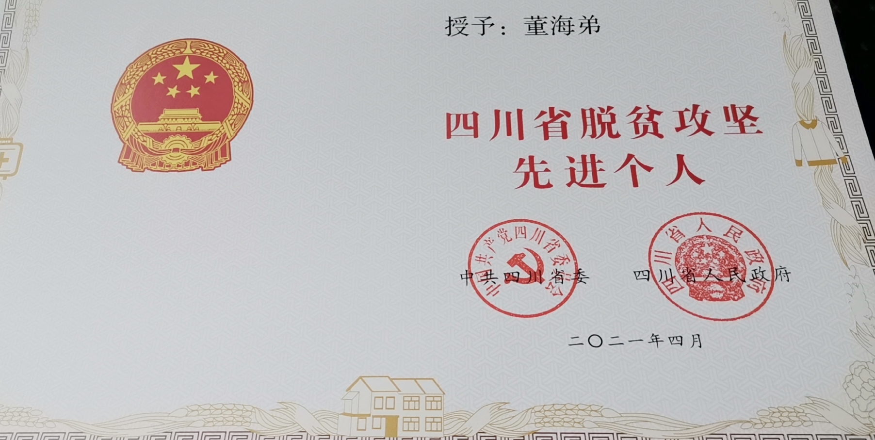 4月22日,四川省脱贫攻坚总结表彰大会在成都召开。大会现场宣读《中共四川省委、四川省人民政府关于表彰四川省脱贫攻坚先进集体和先进个人的决定》,我校驻阿坝州壤塘县茸木达乡甲拉村扶贫干部董海弟(美术与艺术设计学院学办主任、团总支书记)荣获“四川省脱贫攻坚先进个人”表彰。