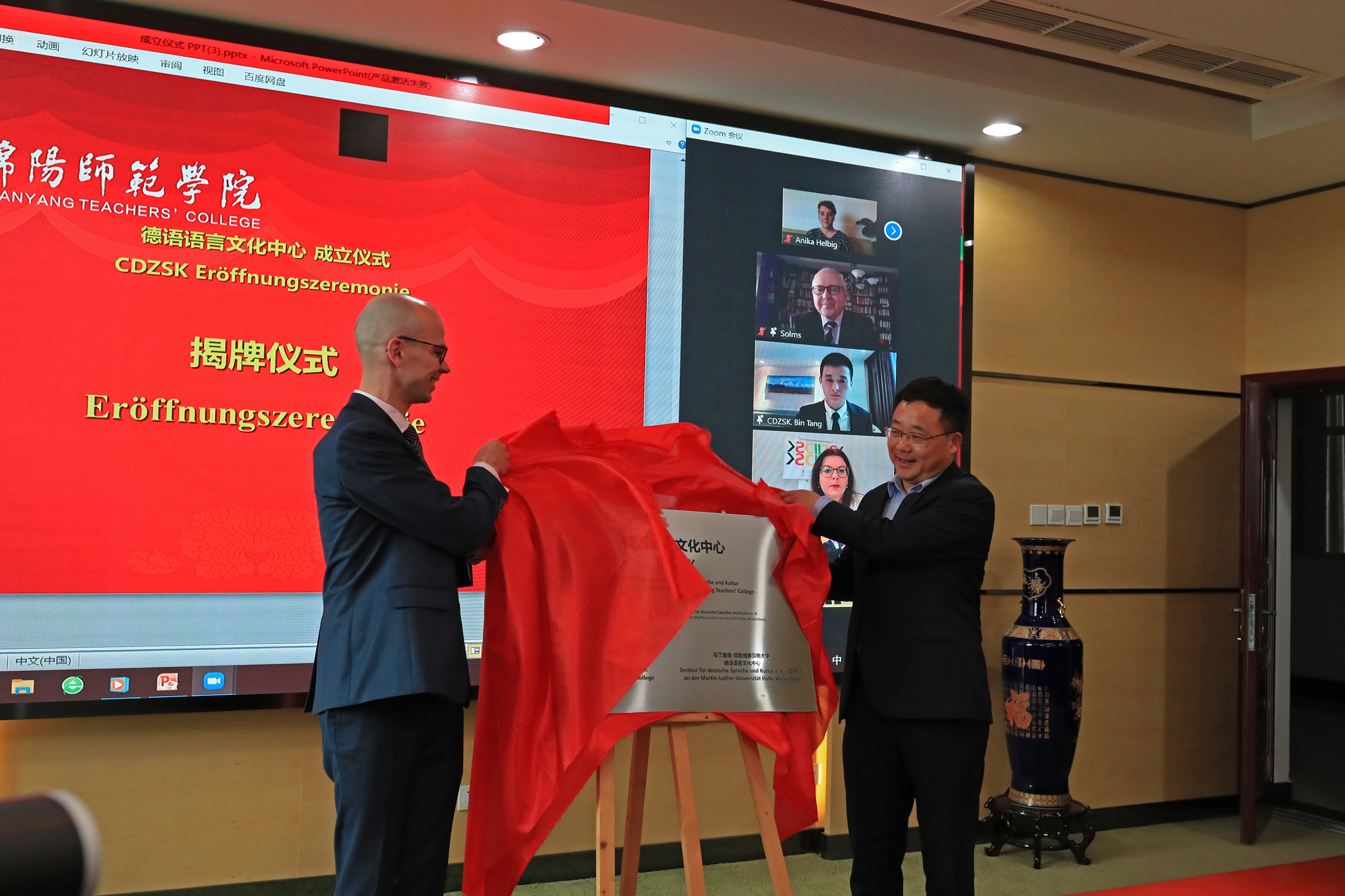 4月19日, “德语语言文化中心”成立仪式在学校高新校区知行楼514会议室举行。该中心的成立开启了学校与德国马丁·路德·哈勒维滕贝格大学深化合作的新征程。德国驻成都总领事馆副总领事邓森(Sebastian Dern),绵阳市外事办公室副主任赵莉、绵阳市委教育工委副书记周时光 、绵阳市对外友好协会副会长李军,学校校长李树勇出席了仪式,学校国交处、外国语学院负责人及德语专业师生代表参加了仪式。仪式由学校党委常委、副校长费文晓主持。