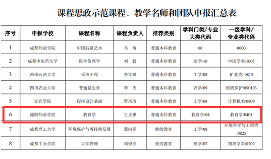 今年3月,教育部启动了首批国家级课程思政示范项目申报,各高校从省级课程思政示范项目中限额推荐,省教育厅组织专家评审后按限额推荐至教育部参评。据悉,此次四川省普通本科教育推荐名额仅6门,《教育学》的成功入围是我校课程思政建设取得的新成绩。