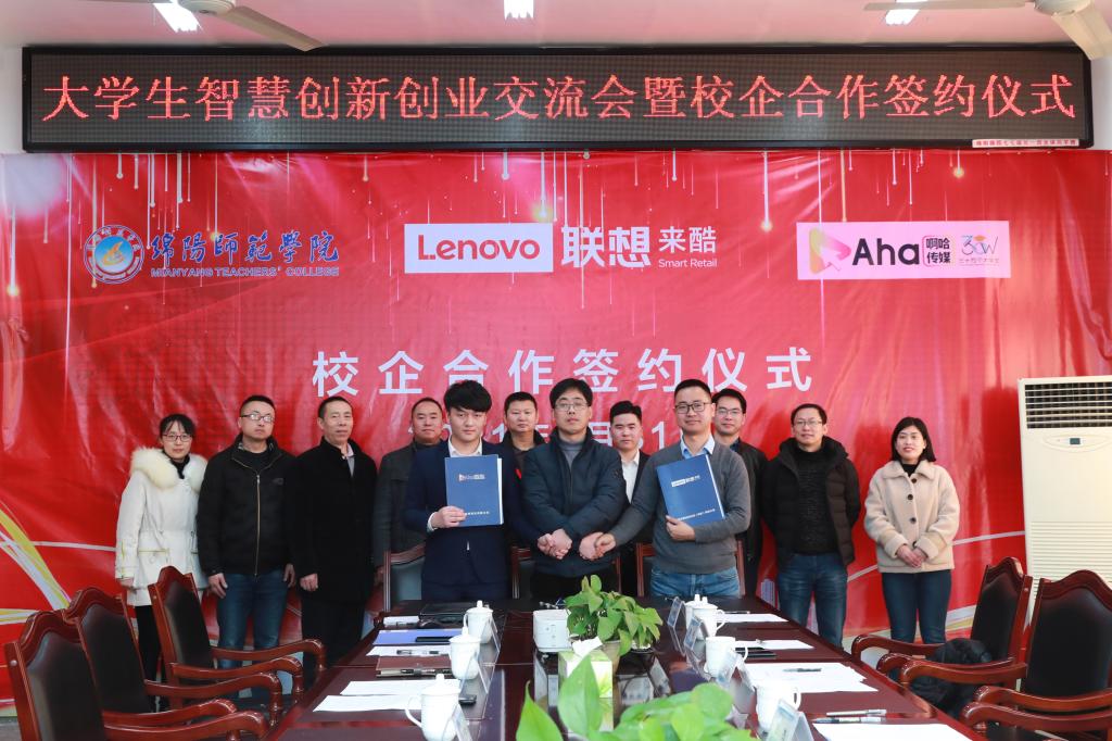 1月31日,学校与啊哈传媒重庆有限公司(简称“啊哈传媒”)、联想智慧零售来酷科技(以下简称:联想来酷)举行大学生智慧创新创业交流会暨校企合作签约仪式。联想来酷四川区域经理付坤元,啊哈传媒重庆有限公司董事长易兴、董事陈冠宇等,学校招生就业处、创新学院、学位与研究生教育处负责人,化学与化学工程学院党政领导及相关人员参加了签约仪式。仪式由化学与化学工程学院党总支相关负责人主持。