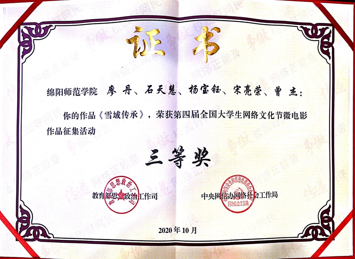 近日,我校传媒学院指导老师杨祖恩、邱广宏指导的学生作品《初心》,在“我心中的思政课”——第四届全国高校大学生微电影展示活动中荣获全国三等奖,这是该作品在四川省“我心中的思政课”活动中获得四川省一等奖后获得的又一项荣誉。另外,传媒学院师生作品《雪域传承》荣获教育部思政司主办的“中国大学生网络文化节”微电影展示活动三等奖,邱广宏获得“优秀指导教师”称号。