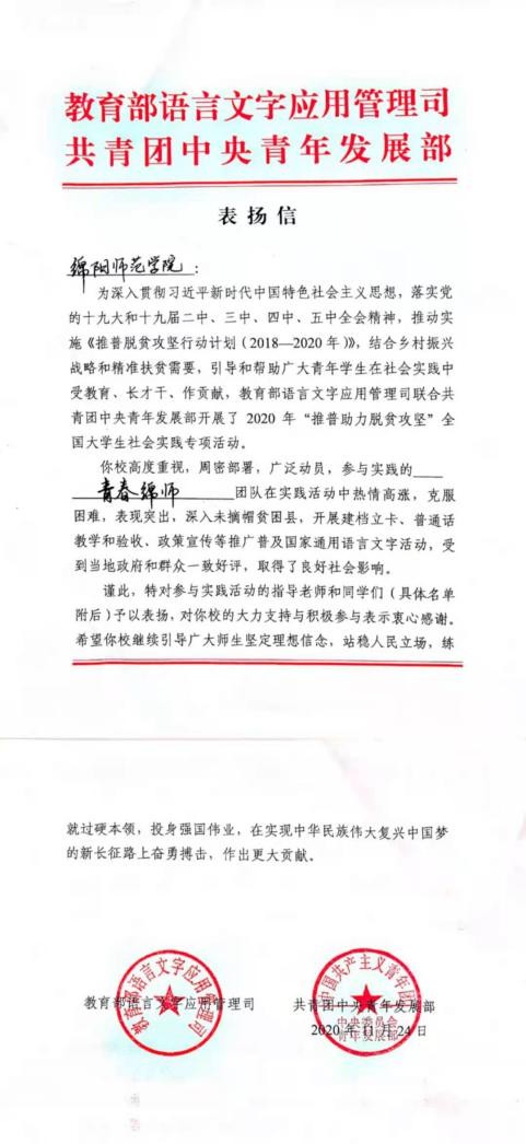 近日,我校“青春绵师”团队在2020年“推普助力脱贫攻坚”全国大学生实践活动中受到教育部语言文字应用管理司、共青团中央青年发展部的提名表扬,感谢学校对此次活动的大力支持,同时对绵阳师范学院团队在社会实践中的工作表现予以表扬。