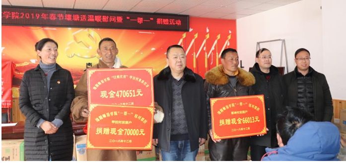 黄永忠一行代表学校向啄坤村、甲拉村69户建档立卡贫困户送上了慰问品和“一帮一”帮扶金。此次活动分别向啄坤村34户贫困户现场捐赠“一帮一”帮扶金66013元,向甲拉村35户贫困户现场捐赠“一帮一”帮扶金70000元,向甲拉村集体经济捐赠“以购代捐”资金470651元,并为啄坤村、甲拉村建档立卡贫困户送上了69袋大米、69桶食用油,为啄坤村幼儿园送上了10袋大米、10桶食用油。