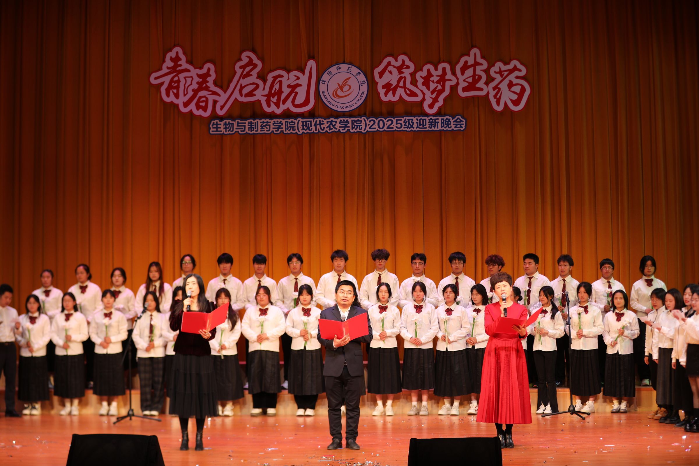 11月20日晚,生物与制药学院“青春启航 筑梦生药”2025级迎新晚会于行知音乐厅举行。学院党政领导班子、全体教师及2025级新生共同出席。学院党政领导班子高度重视本次晚会,提前统筹部署,对筹备工作全程指导,并在主题设定、节目编排等关键环节严格把关,通过这一视听盛宴传递学院的人文关怀与集体温暖。晚会伊始,学院负责人代表领导班子致辞,向全体新生表示热烈欢迎,并介绍了学院的办学特色。他寄语新生:以“格物致知”的钻劲锤炼专业本领,以“守正创新”的勇气涵养科学精神,以“精业济民”的担当书写卓越人生。