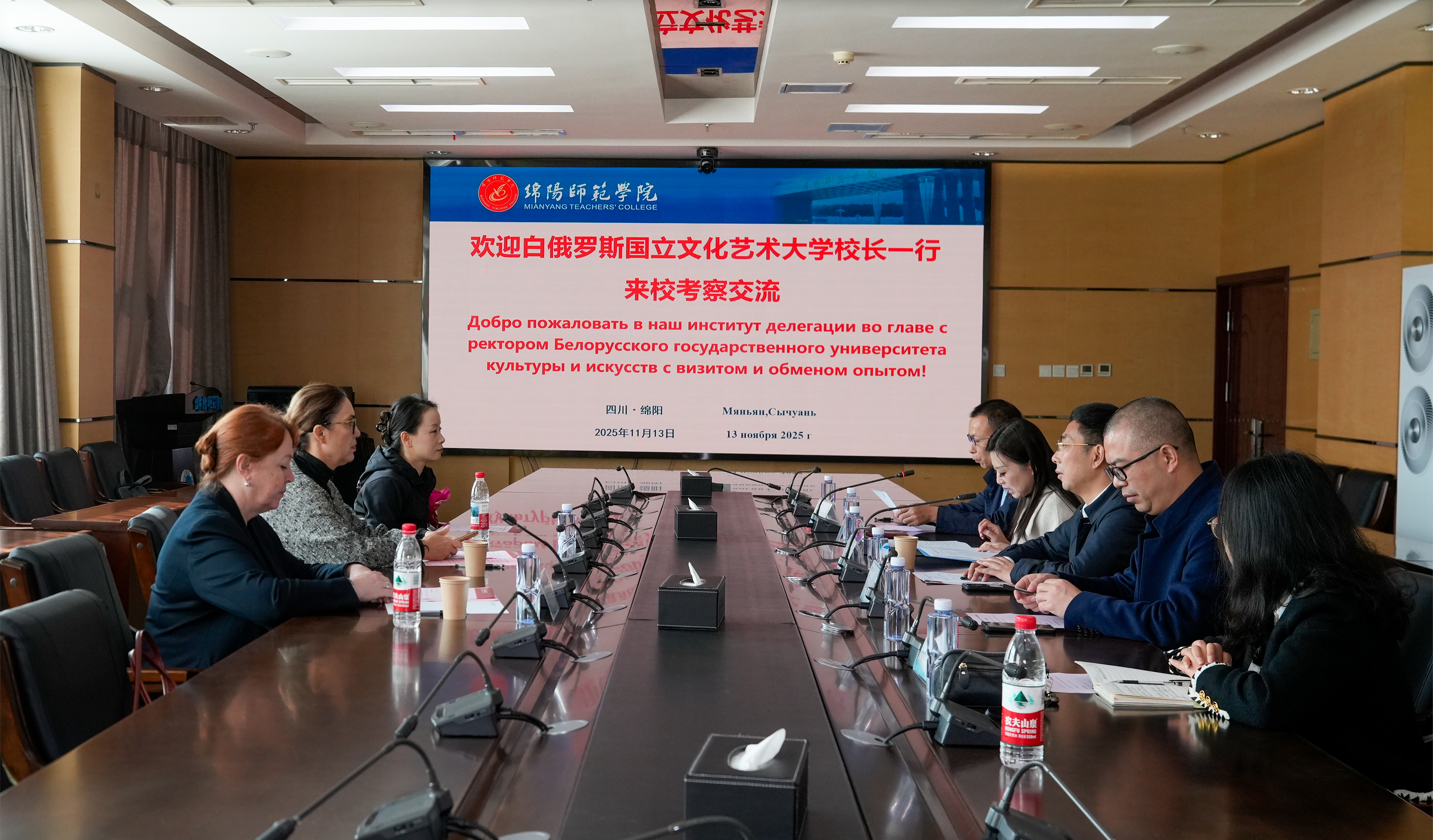 11月13日上午,白俄罗斯国立文化艺术大学校长娜塔莉亚·弗拉基米罗芙娜、副校长叶莲娜·叶甫根尼耶夫娜一行来校考察交流。学校党委常委、副校长蒋伟在知行楼514接待来宾,座谈会由对外合作处负责人主持。