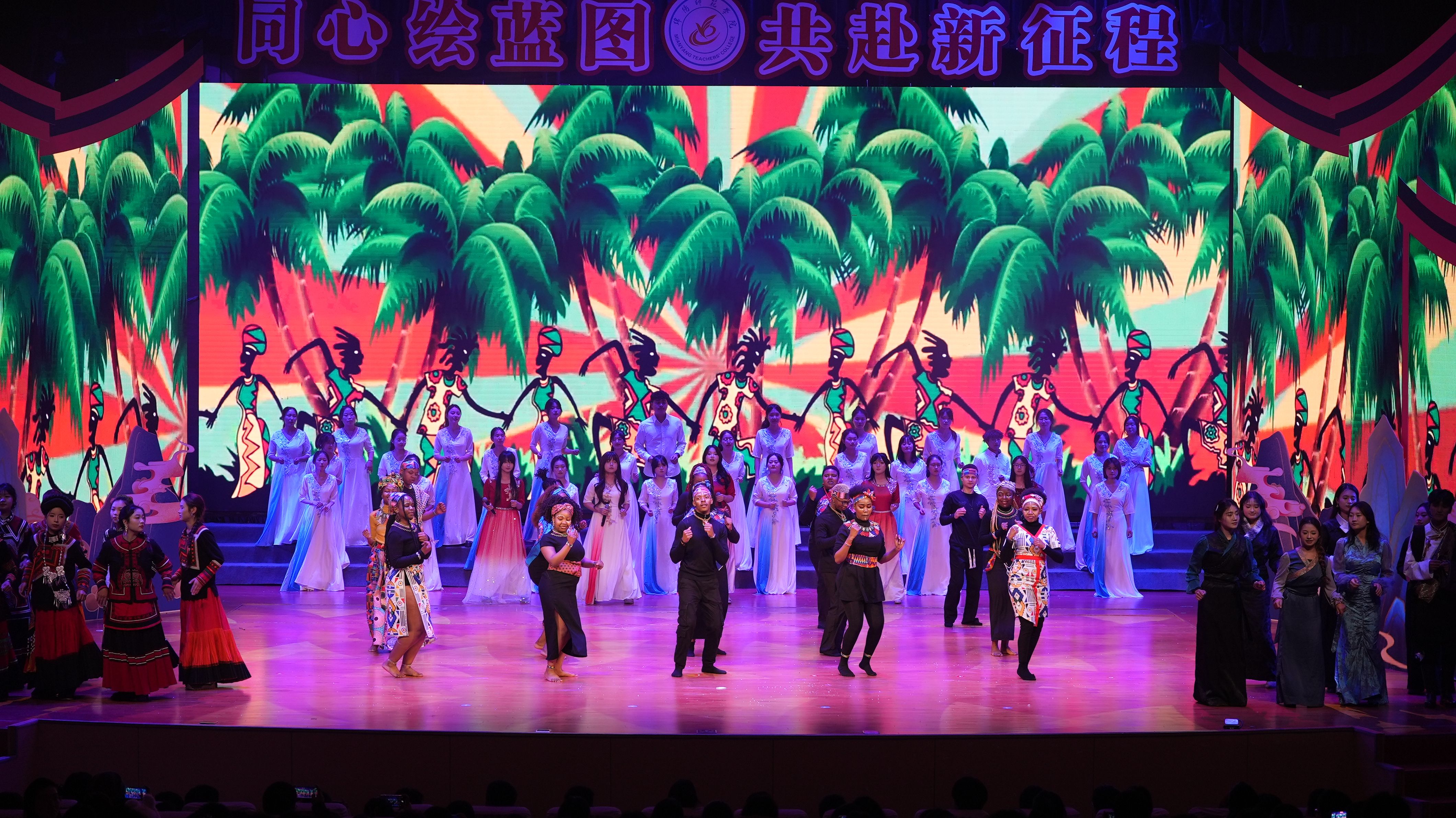晚会在《盛世欢歌》中落下帷幕,校领导、留学生代表与全体演职人员登台,歌声与掌声交织成欢乐的海洋。新的一年,全体绵师人将以更饱满的热情砥砺前行,共同书写学校高质量发展的新篇章。