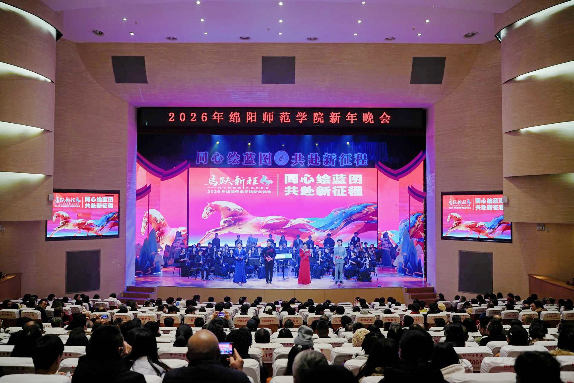 12月30日晚,高新校区行知音乐厅灯火璀璨、人声鼎沸,“同心绘蓝图 共赴新征程”绵阳师范学院2026年新年晚会温情启幕。全体校领导、离退休老同志代表与500余名师生代表欢聚一堂,用一场精彩纷呈的文艺盛宴辞旧迎新,共度新春。