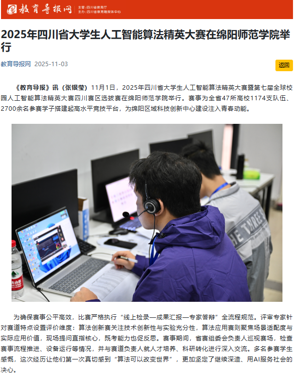 11月1日,2025年四川省大学生人工智能算法精英大赛暨第七届全球校园人工智能算法精英大赛四川赛区选拔赛在绵阳师范学院举行。赛事为全省47所高校1174支队伍、2700余名参赛学子搭建起高水平竞技平台,为绵阳区域科技创新中心建设注入青春动能。